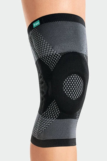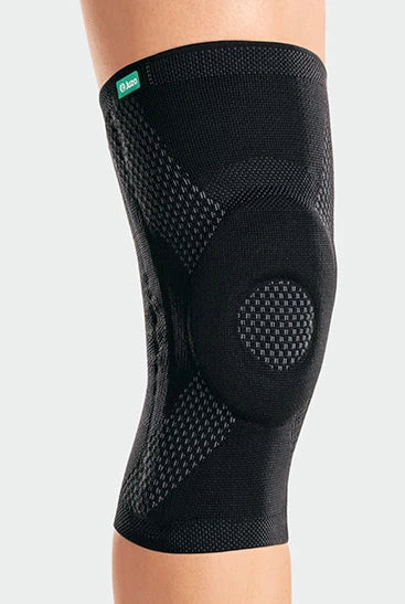 O anel rotuliano, de forma anatómica, orienta a rótula e, durante o movimento, massaja adicionalmente os músculos circundantes. Os rebordos com pressão minimizada envolvem o suporte da joelheira elástica Genu Xtra, evitando que o tecido se comprima e assegurando desse modo um efeito compressivo ótimo.