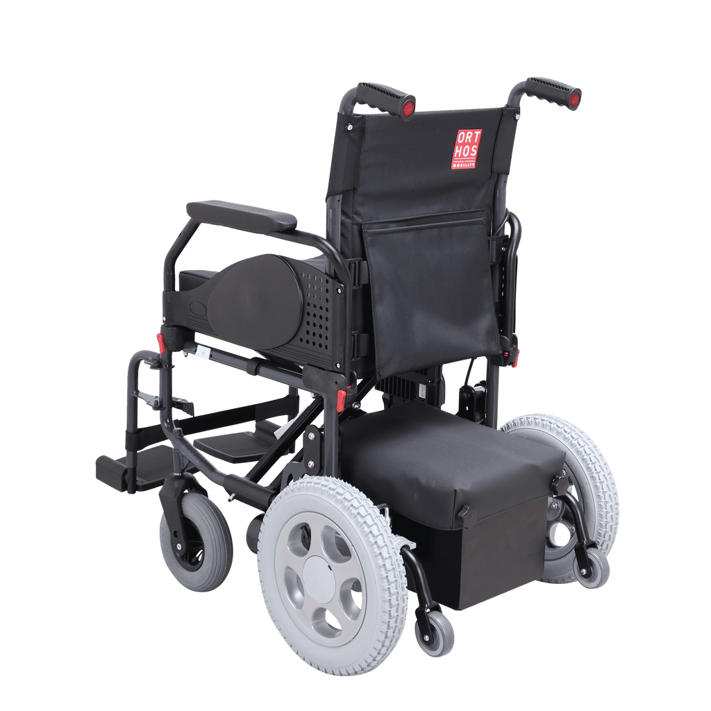 AZTECA, cadeira elétrica para uso interior e exterior. Com dimensões compactas, tem estrutura de encartar, facilitando a arrumação e transporte. Comando manual à direita (de série) sendo possível colocá-lo à esquerda. Os apoia braços são destacáveis, os apoia pés são destacáveis, rebatíveis para dentro e para fora e reguláveis em altura. O cesto que suporta as baterias é destacável permitindo o fecho da cadeira de forma a ocupar menos espaço durante o transporte. É possível desligar o sistema elétrico e funcionar com a cadeira manualmente, através de um manípulo existente junto às baterias. As dimensões compactas permitem uma boa manobrabilidade (raio de rotação de 920mm). Rodas pneumáticas à frente e atrás para amortecer os impactos e assim assegurar uma condução mais cómoda. Possui rodas anti queda. Inclui ainda almofada de assento em memory foam com formato anatómico. Baterias de gel AGM herméticas sem manutenção 12V e 38Ah, colocadas em duas caixas de forma a dividir o peso para ser mais fácil retirar da cadeira. Carregador de baterias de 24V e 5A. Motor com potência de 200W. Autonomia de 25km, velocidade máxima para a frente de 6Km/h e em marcha atrás de 3Km/h, em condições normais de piso e peso do utilizador. Peso máximo utilizador: 125Kg.