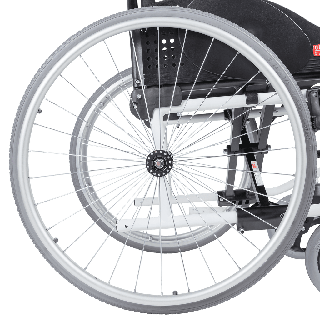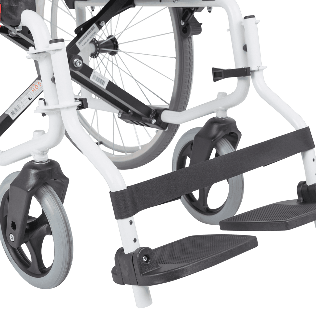 LATINA COMPACT, cadeira em alumínio com cruzeta tripla, compacta e leve com estrutura branca ou cinzenta e estofos em preto. A cadeira possui apoia braços rebatíveis e apoia pés ajustáveis em altura, rebatíveis e destacáveis. Rodas traseiras de 600mm maciças, com jantes raiadas e com sistema quick release (extração rápida e fácil), para fácil transporte e arrumação. Rodas dianteiras maciças de 200mm. Largura do assento: 400,430,460mm. Peso máximo de utilizador: 125Kg.