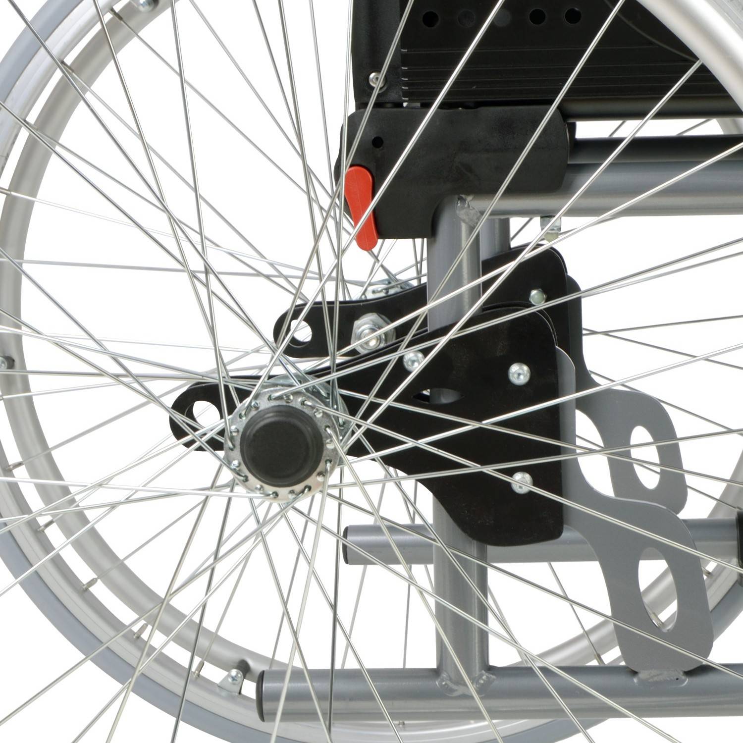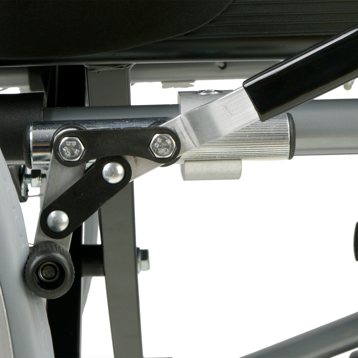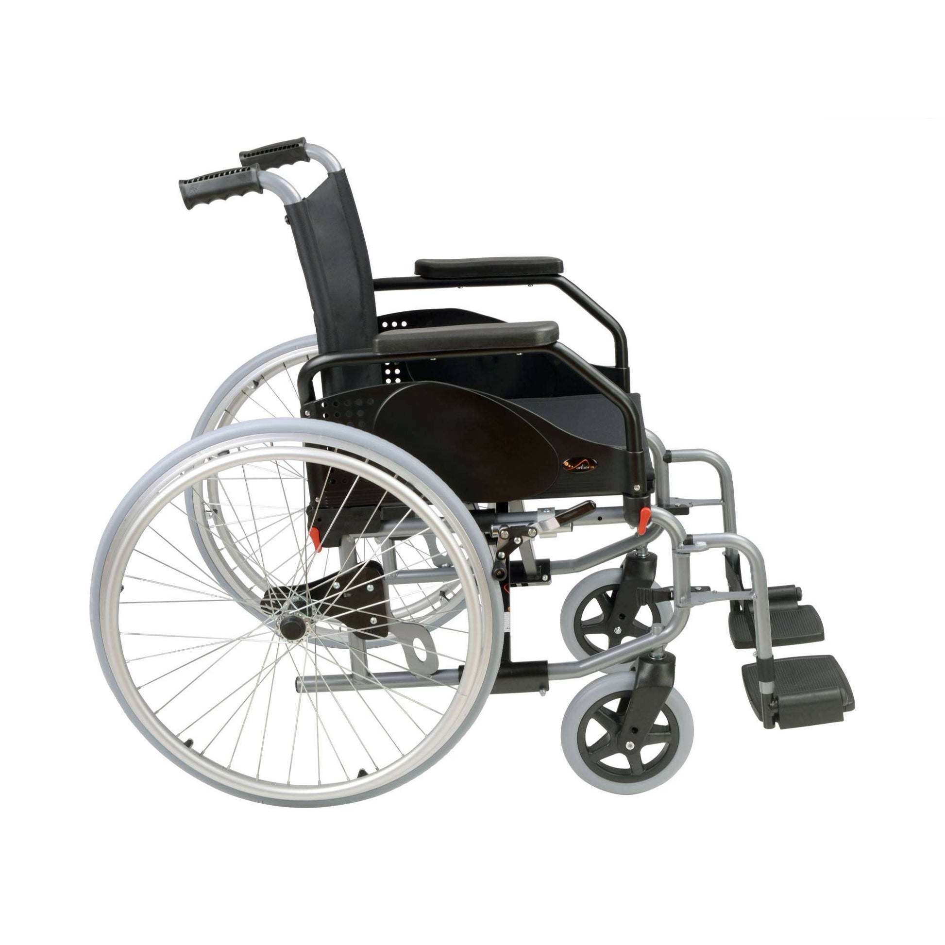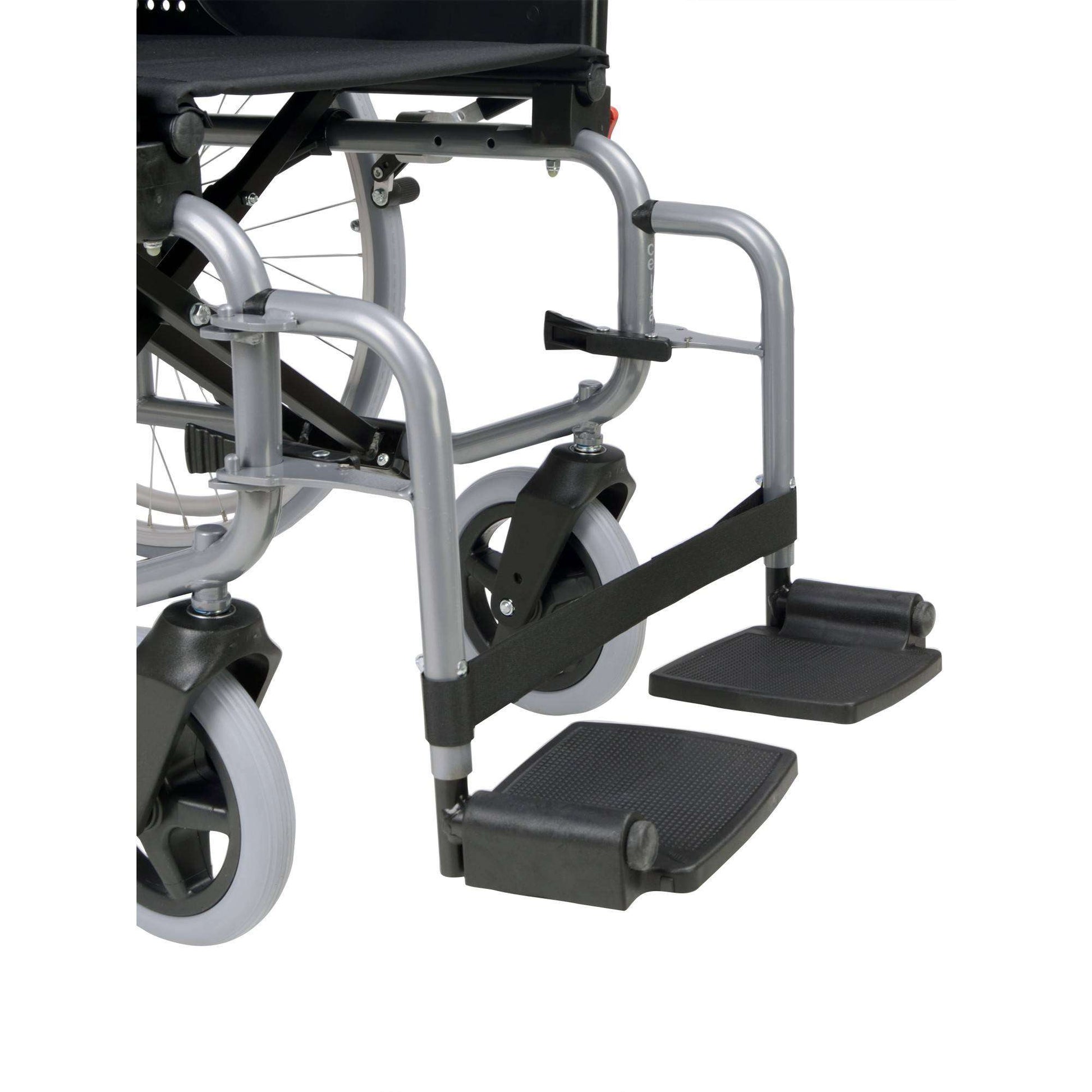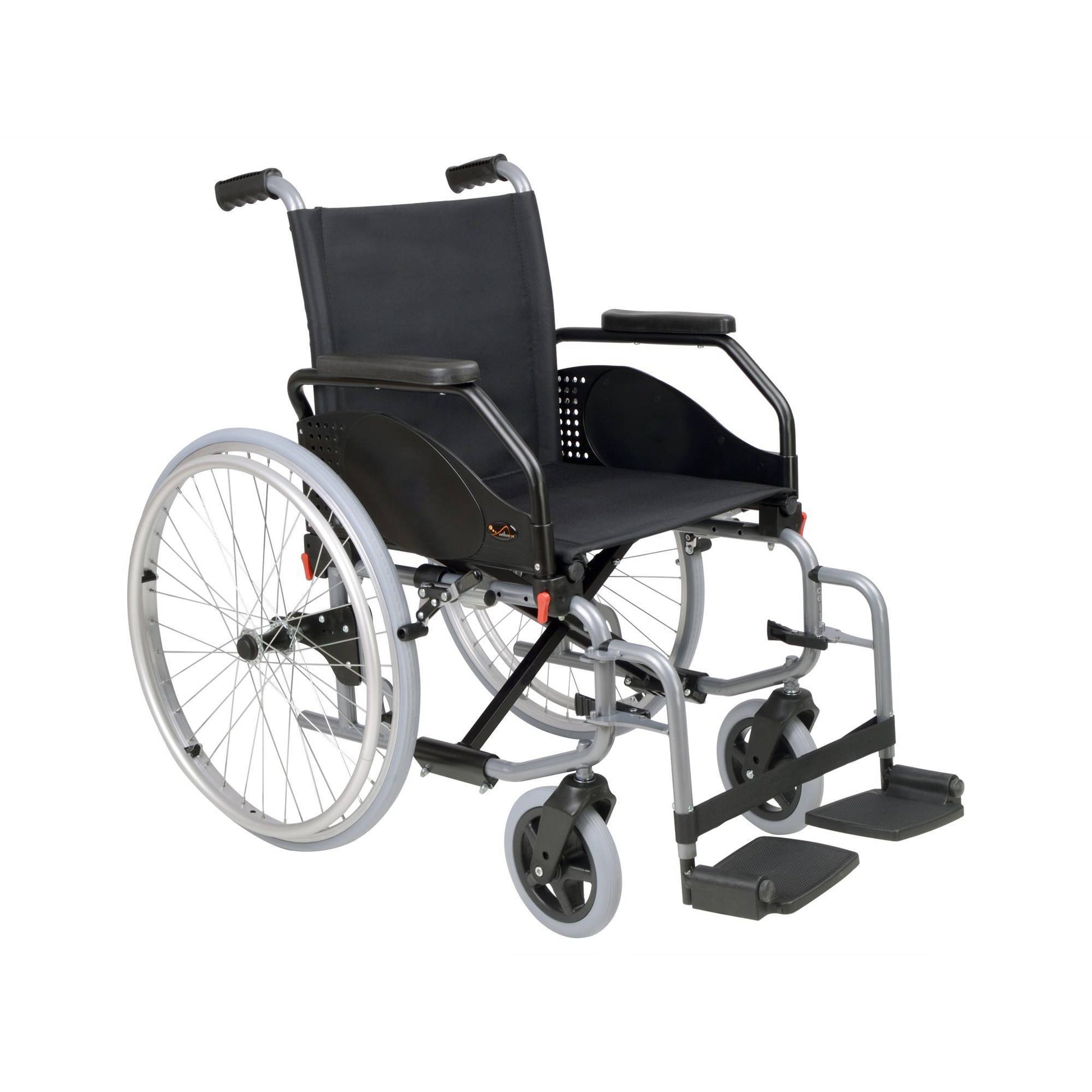 Cadeira de rodas manual em aço com estrutura robusta e cruzeta tripla para proporcionar maior resistência. Indicada para utilizadores amputados, possibilita a aplicação do eixo recuado a 10 ou 15cm do eixo normal, de modo a proporcionar uma distribuição equilibrada das cargas e assim prevenir quedas. Possui apoia-braços facilmente destacáveis, patins destacáveis, rebatíveis para fora e reguláveis em altura. Rodas traseiras de 600mm pneumáticas com aro em alumínio e jantes raiadas. Encartável de modo a facilitar o transporte e arrumação.