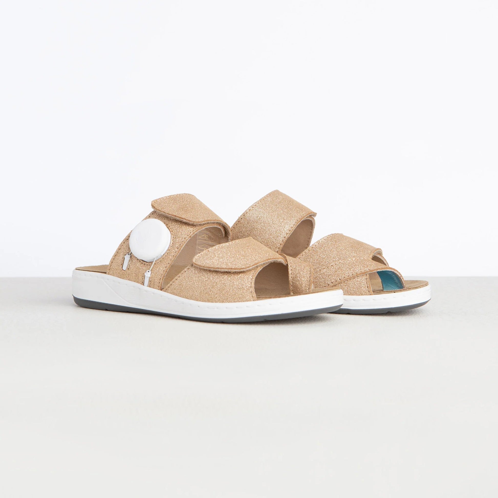 O calçado certo para Hallux Valgus (Joanete). A deformidade do Hallux Valgus é suavemente corrigida com a ajuda da tira no 1º dedo, ajustável individualmente. As "SunGo" são douradas. O couro superior consiste em couro liso de alta qualidade.