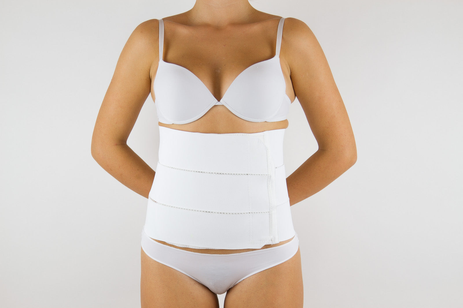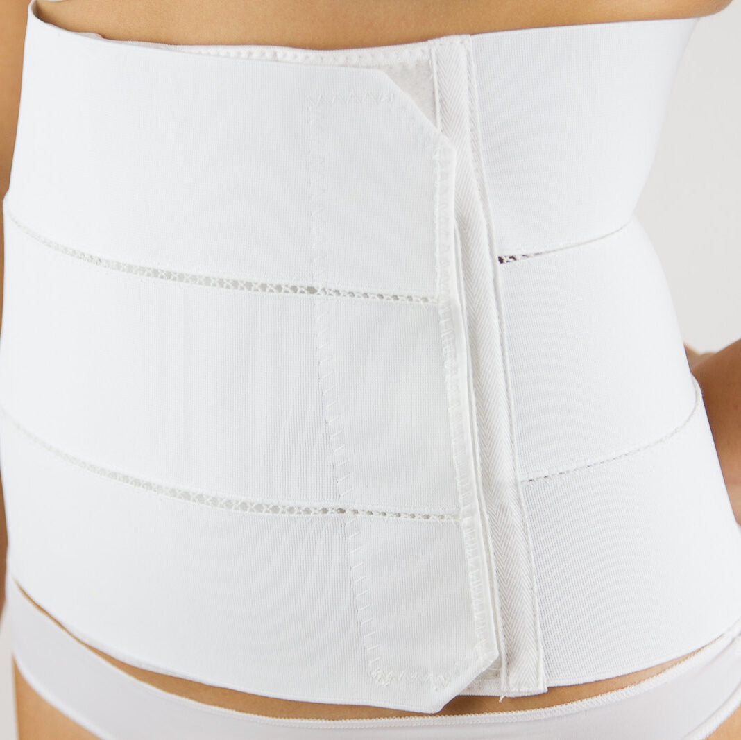 Faixa pós-operatória Abdominal, com três bandas flexíveis, respiráveis e ventiladas. Com uma altura de 24cm, adapta-se ao corpo de forma anatómica e justa, sendo o aperto feito à frente por velcro.
