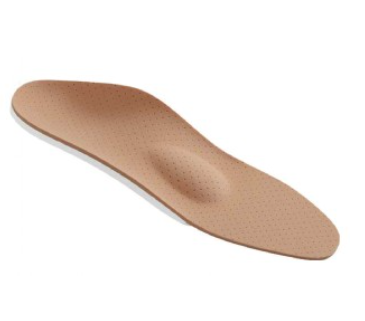 Palmilhas com apoio do arco e descarga retro capital fabricado em duas camadas, a superior em multiforme perfurado bege e a inferior em EVA branco com a parte superior do apoio plantar destacado.