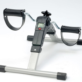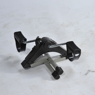 É equipado com roda de regulação para mudar a resistência da pedalagem, visor LCD, consumo de calorias e pedais com correias.